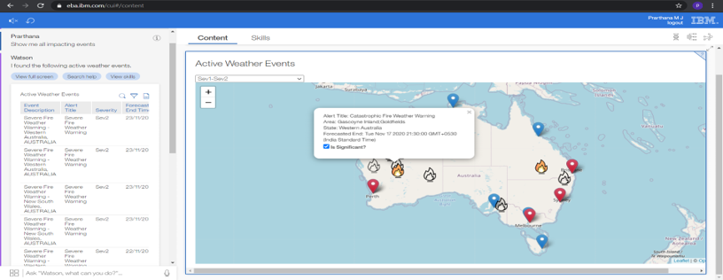 Finally, using data from the IBM Weather Channel; a model was also implemented that identified inventory items that were at risk of being impacted by events like fires or floods across the country. This would enable the customer's team to proactive action by ensuring that sufficient supply of material can be made ready to be deployed to a danger spot if required.